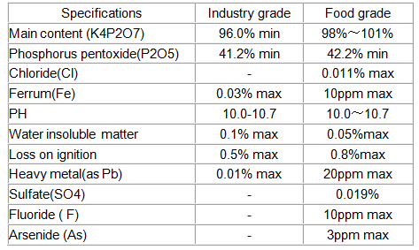 Properties: Anhydrous tetrapotassium phosphate is in white powder. Relative density 2.3534 and melting point 1109°C; It is apt to absorb humidity in the open air to deliquescent; Soluble in water but insoluble in ethanol, and at 25 ,its solubility in water is 187g/100g water; It can chelate with alkaline metals ions or heavy metal ions.